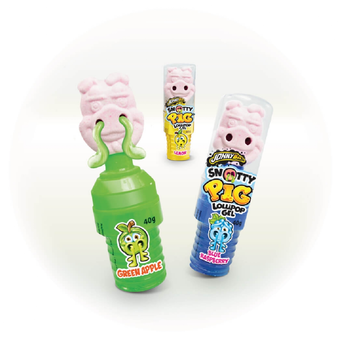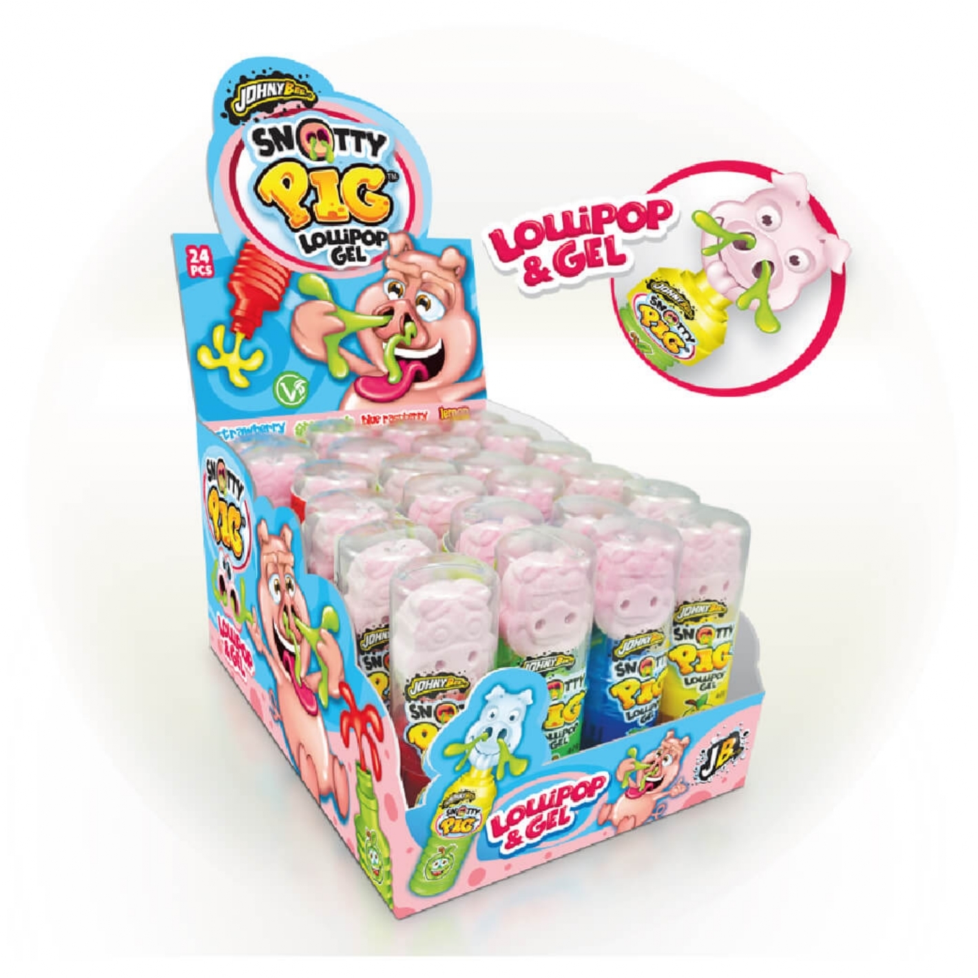 Nouveau Snotty Pig Johny Bee| Sucette Avec Bonbon Gelifié Sortant Du Nez| Goût : Fraise, Pomme, Framboise Bleue, Citron| En Display De 24 Pièces| Dimension Display : 210X150X115 Mm| (Poids Net : 40 G)| (Poids Brut : 50,26 G)| Dlc 30/07/2025
