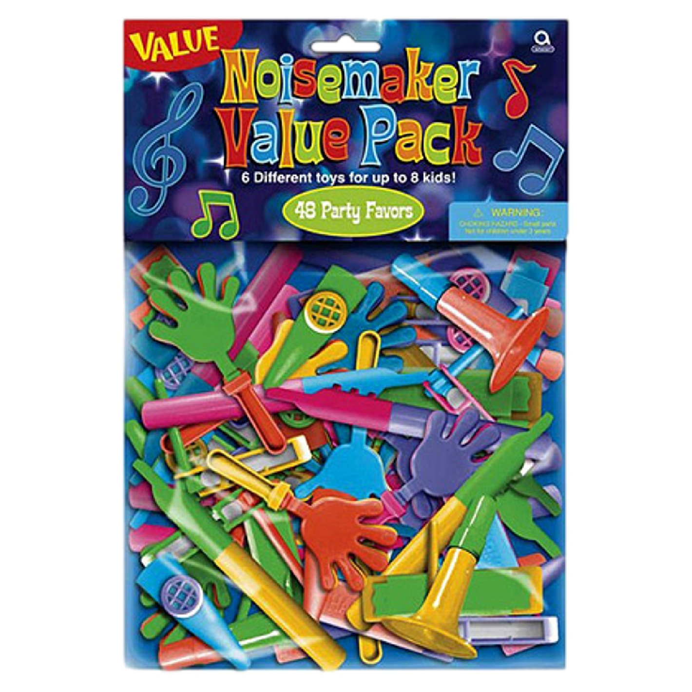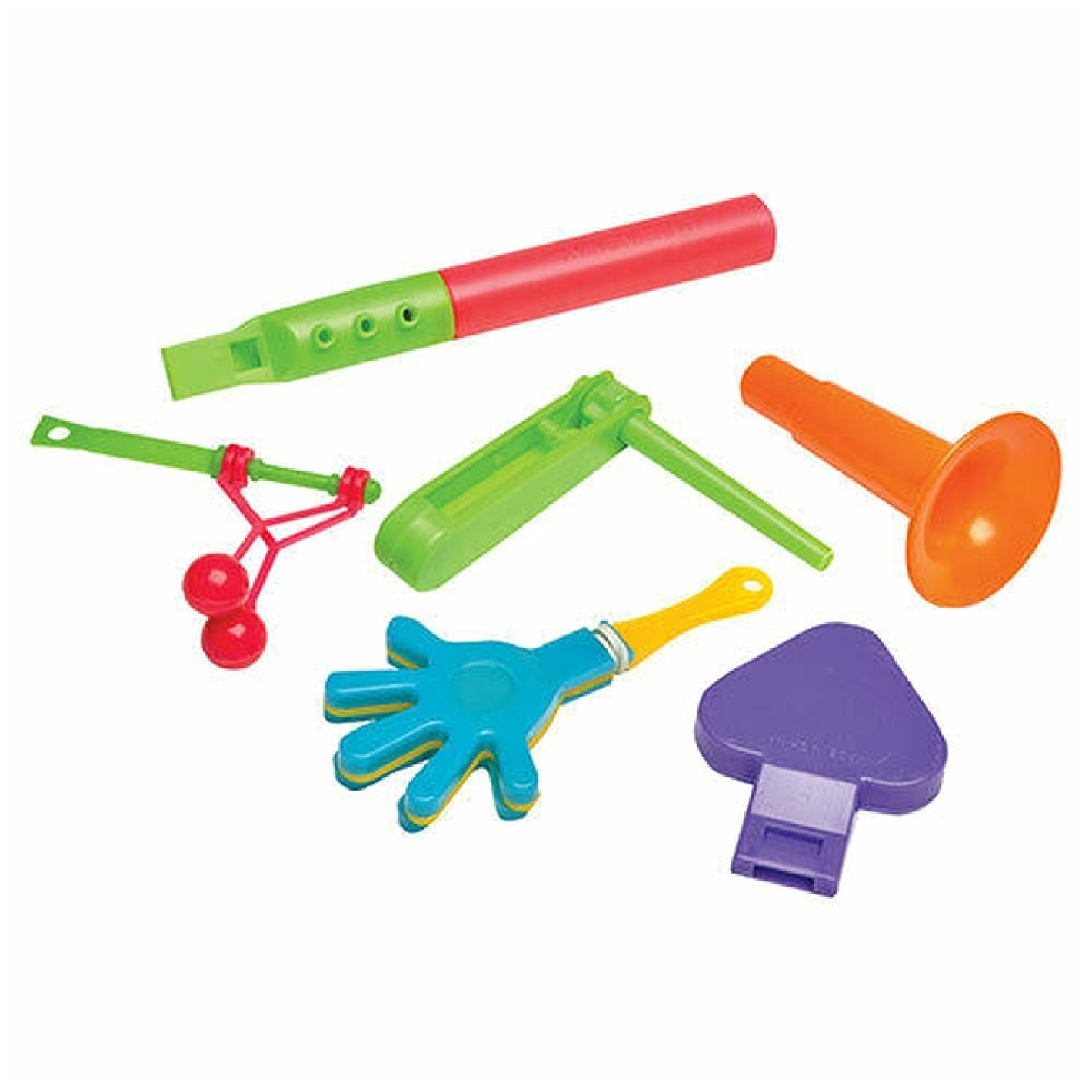 Contient : 8 cornets, 8 sifflets, 8 crécelles bruyantes, 8 mains claquantes, 8 gazous, 8 flûtes.