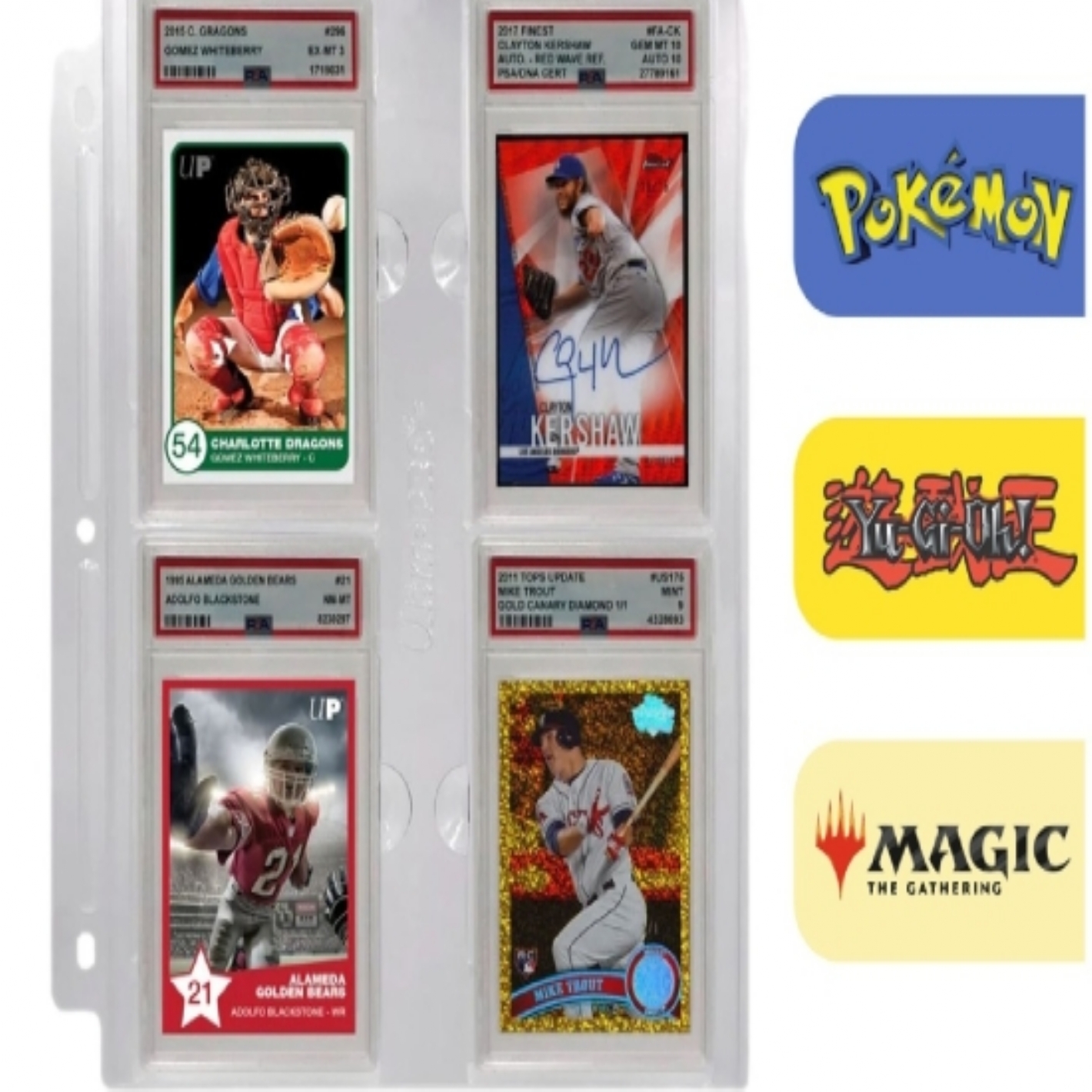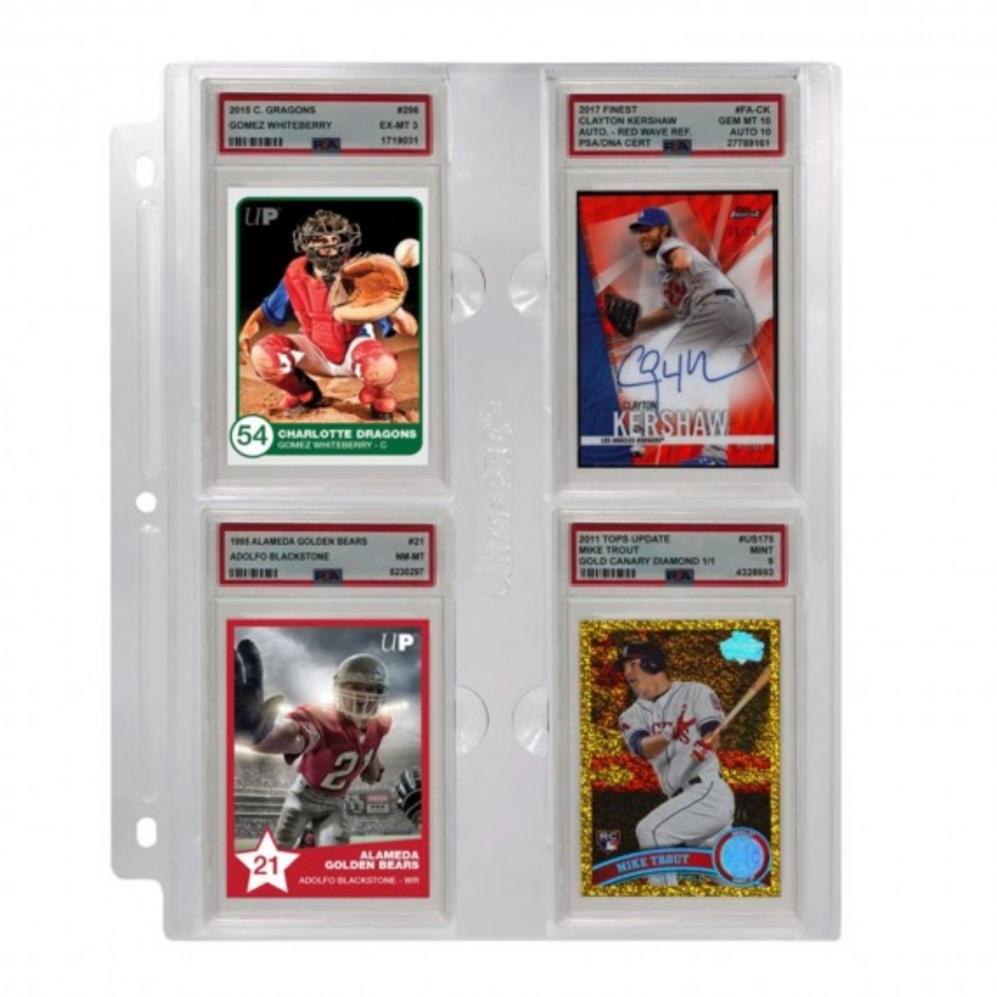La page pour dalles gradées est le moyen idéal de ranger, d'organiser et de visualiser facilement vos dalles de cartes gradées dans un album à 3 anneaux. Cette page est conçue pour contenir 4 plaques graduées PSA dans une page rigide perforée à 3 tro